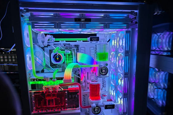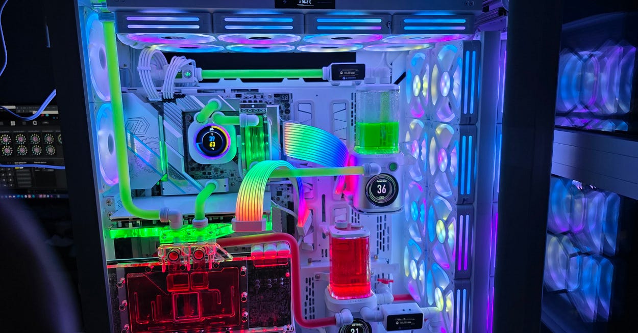 Hai hệ thống trong một case với tản nhiệt nước custom dùng để train AI, chơi game và làm việc.